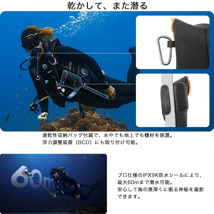 (BCD)に取り付けることができます。陸上でも水中でも使用可能です。