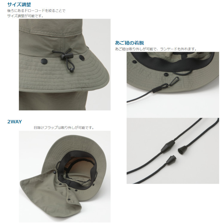 UVカット&遮熱加工した2WAYのハット襟元のフラップが取り外し可能で、海辺や山、川などの強い日差しから、しっかりガードします。