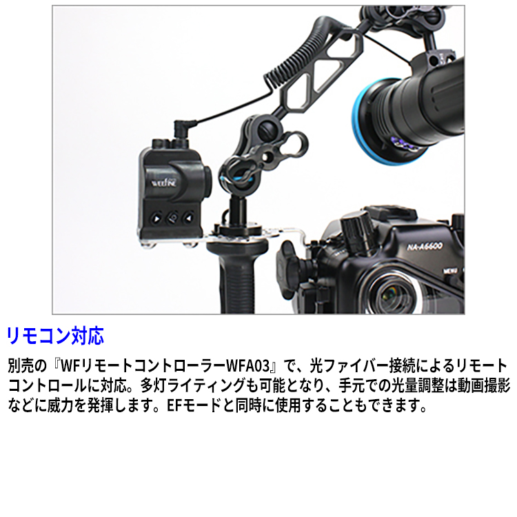 最大13000ルーメン、5600K、演色性Ra90の大光量と、ドームレンズによるムラのない150°の配光は、動画撮影の光源や広範囲のサーチライトに最適です。調光ダイヤルで、0〜100%の12段階の光量調整が可能。別売の『WFリモートコントローラーWFA03』で光ファイバー接続によるリモートコントロールに対応。多灯ライティングも可能となり、手元での光量調整は動画撮影に威力を発揮します。【仕様】